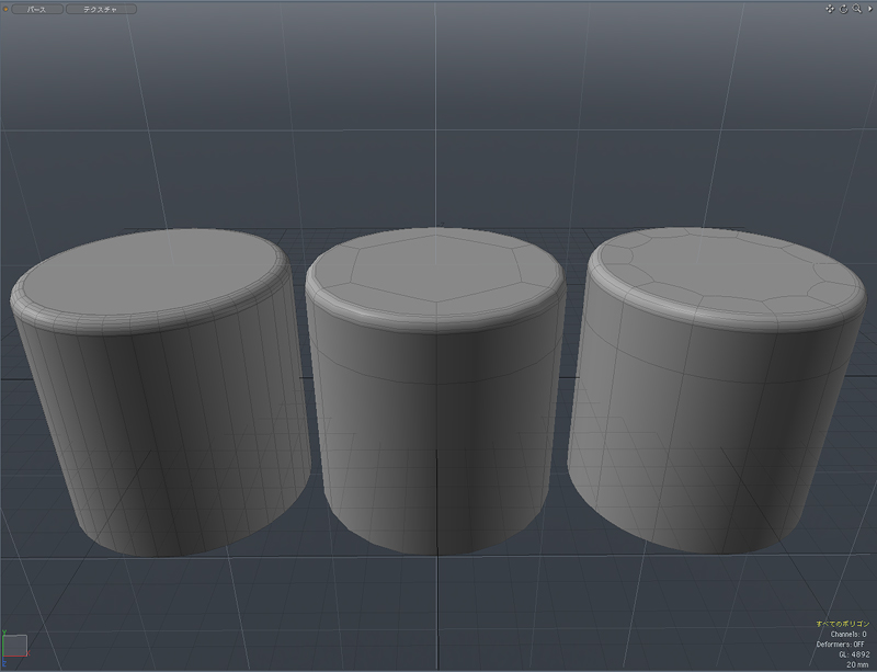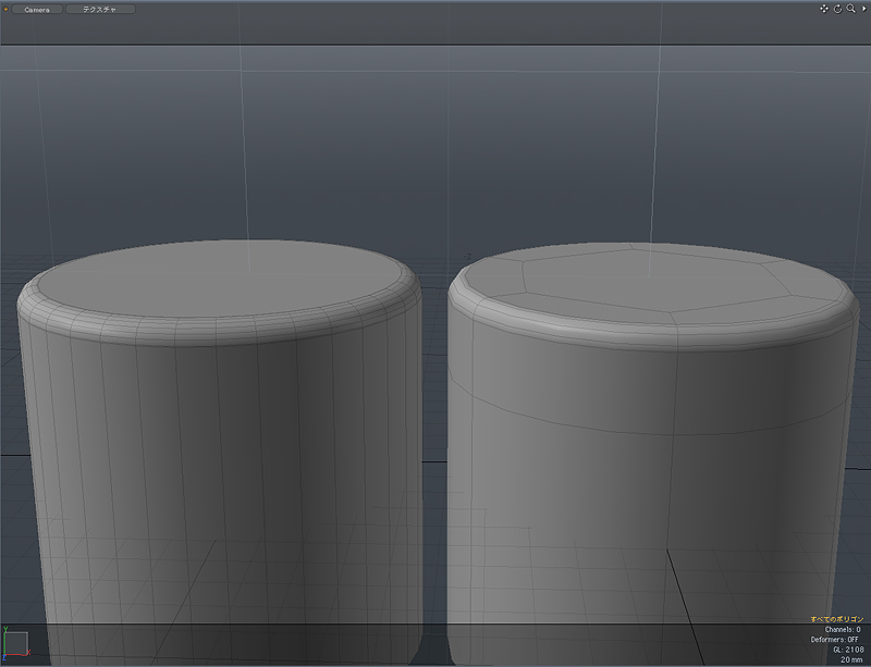 実は、左は円柱にエッジベベルをかけて丸めたものに、スムージングの処理としてエッジを追加したもの。要するにポリゴンモデリングの基本の基本です。