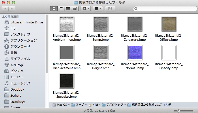 そうすると、SubstancePlayerと同じようにスペキュラーマップ、ノーマルマップ、バンプマップ、その他マップが自動で生成されます。