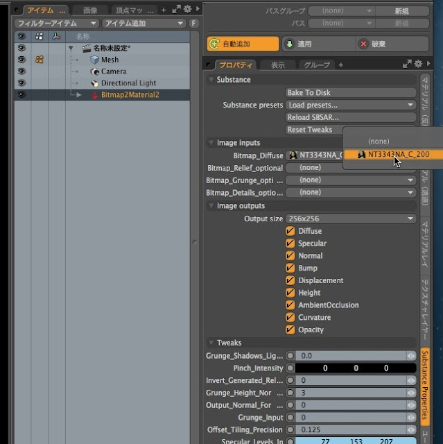 アイテムリストのBitmap2Material 2を選択してSubstanceのプロパティのBitmap_Diffuseで読み込んだテクスチャーを選択します。