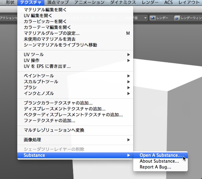 MODO701のメニューバーのテクスチャからSubstanceのOpen A SubstanceからBitmap2Material_2.sbsarを開きます。