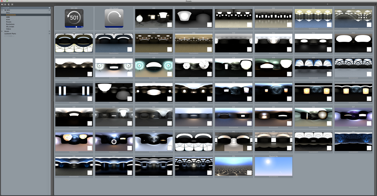 modoの場合は、EnvironmentsのStudioのプリセットにスタジオのパノラマHDRIが37点収録されています。
