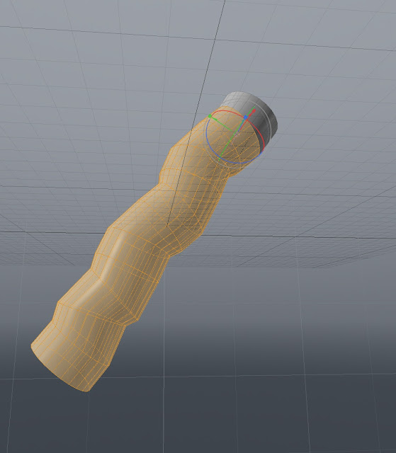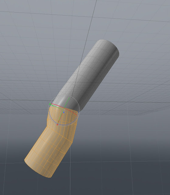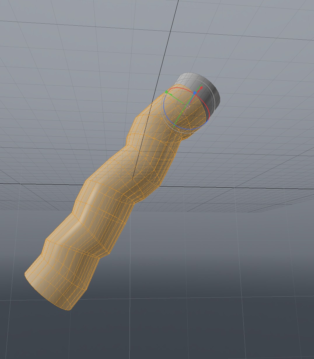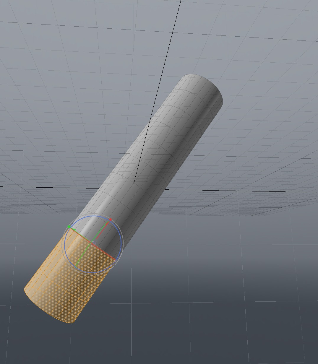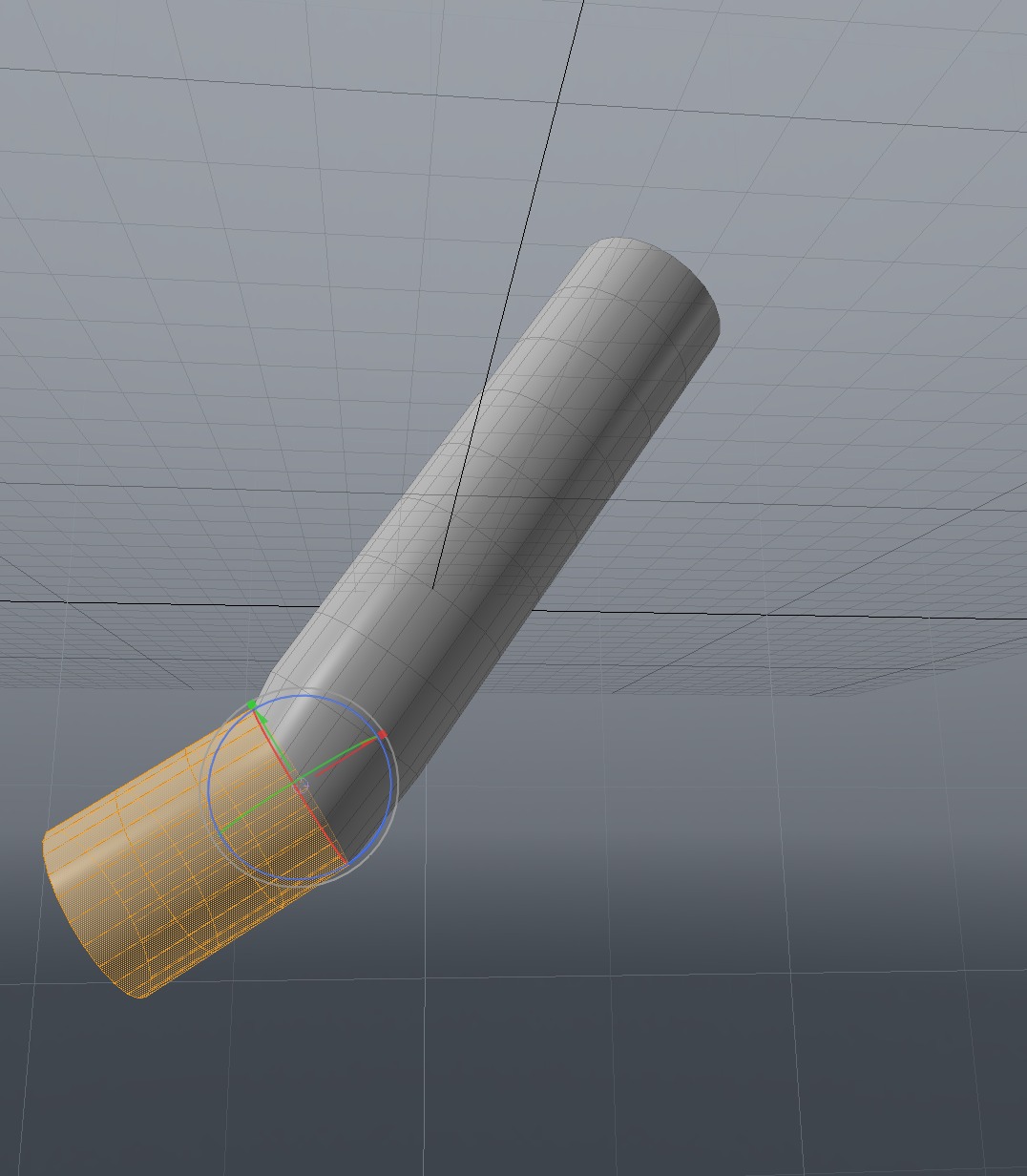 アクションセンターを選択境界にセットした状態なので、選択したポリゴンの境界線の中心に軸ハンドルの位置がセットされています。また、方向はパイプの方向に合っているのがわかると思います。選択境界で作業する場合は、軸ハンドルをトランスフォーム(移動、回転、スケールが使える軸ハンドル)を使うのが便利です。