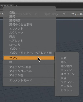 「自動中心」は頂点、エッジ、ポリゴン全ての種類のエレメントが対象で、クリックしたエレメントの中心に軸ハンドルがセットされます。この項目はスナップの項目と同じなので、理解しやすいはずです。要するにアクションセンターの「エレメント」は軸ハンドルをエレメントにスナップさせるわけですから。