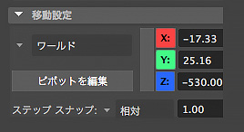またモデリングツールキットからでも軸のロックはできます。赤のXのボックスをクリックするとYとZのボックスはグレーになってX方向だけがフリーになります。またマニピュレータの絶対値も表示されているの色々と便利ですし、数値を入力することもできます。マニピュレータの話からはそれますが、ピボット編集の下にあるステップスナップは、MODOで言うところの「固定増分値」、CINEMA4Dだと「量子化」です。要するに1.00だと1cm刻みで移動します。例えば変更作業でいろんな箇所で3cm移動させる場合にMODOだと固定増分値を30mmにセットします。ただMODOはこの設定が初期設定にあって使い難いのでフォーム編集でツールバーに追加したりします。